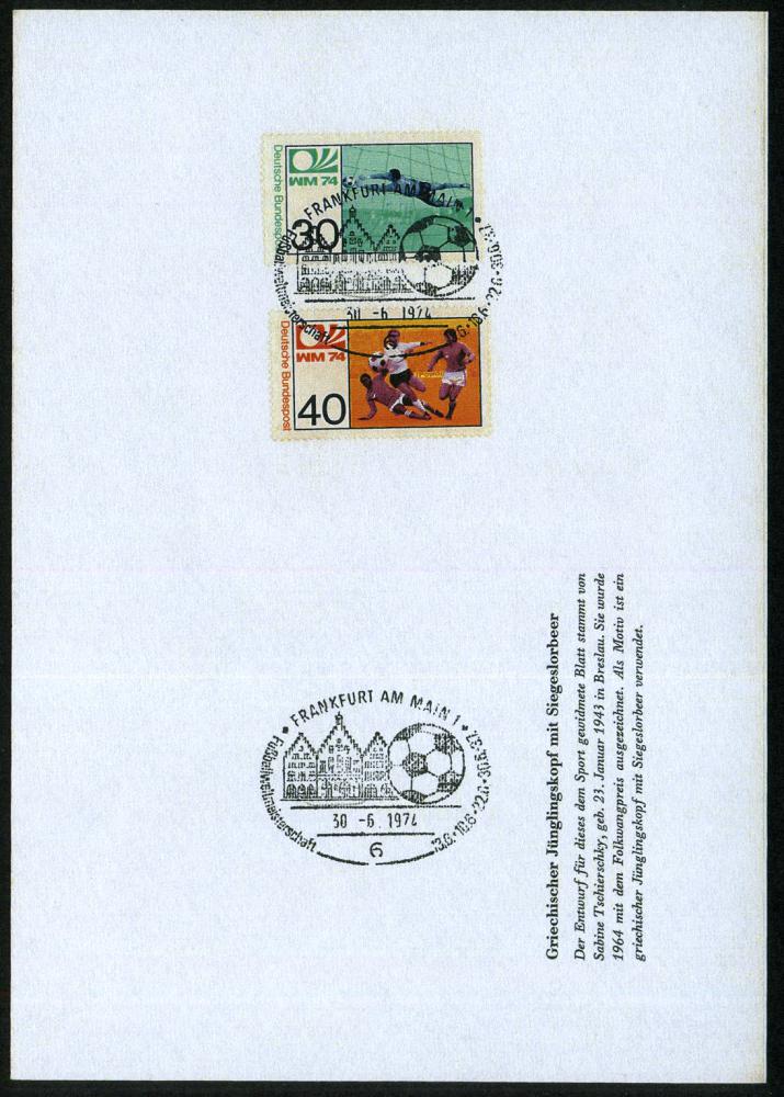 186 | 18 € | 6 Frankfurt/Main Sonder- und Handwerbestempel : 6 FRANKFURT AM MAIN 1/ Fußballweltmeisterschaft.. 1974 (30.6.) SSt = Fußball (u. Rathaus "Römer") a. kompl. Satz Fußball-WM (Mi.811/12) a. Schmuckblatt-Telegramm "Sport" (Griech. Jüngling m.Siegeslorbeer) ungebr. | ![]() ![]() | |