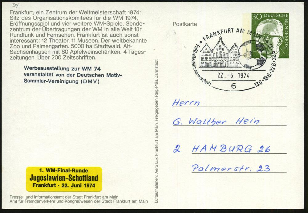 188 | 12 € | 6 Frankfurt/Main Sonder- und Handwerbestempel : 6 FRANKFURT AM MAIN 1/ Fußball-WM 1974 (22.6.) SSt auf PP 30 Pf. Heinemann, grün: Fußball-WM (= Stadion, "Römer", Goethehaus, Dom etc.) + Label: 1.WM-Final-Runde: Jugoslawien - Schottland.., klar gest. Inl.-Kt. (Mi.PP 46/18) | ![]() ![]() | |
