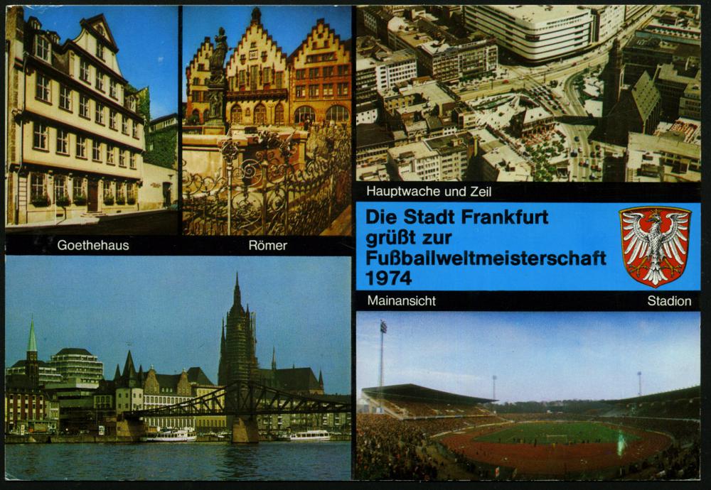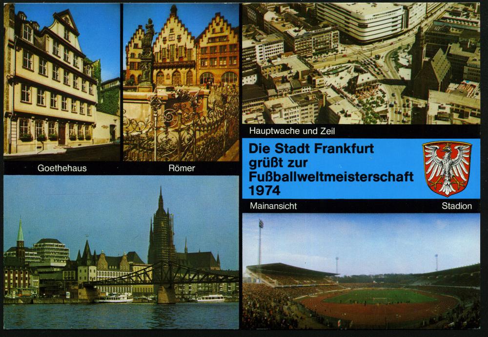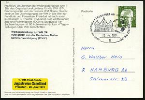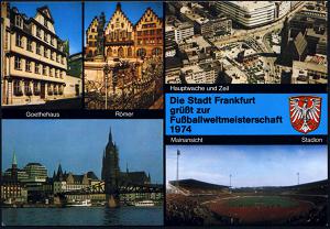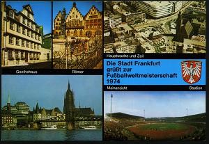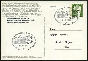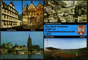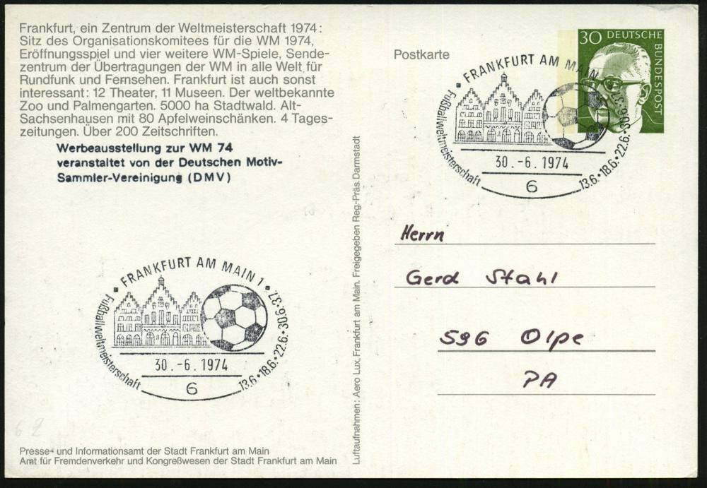 189 | 12 € | 6 Frankfurt/Main Sonder- und Handwerbestempel : 6 FRANKFURT AM MAIN 1/ Fußballweltmeisterschaft.. 1974 (30.6.) SSt auf PP 30 Pf. Heinemann, grün: Fußball-WM 1974 (5 Ansichten, dabei Stadion, Goethehaus, "Römer", Dom etc.) Inl.-Karte (Mi.PP 46/18) | ![]() ![]() | |