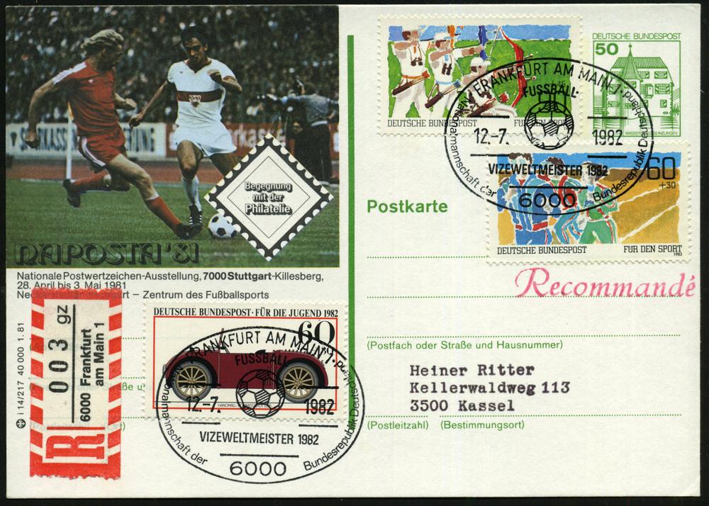 196 | 15 € | 6 Frankfurt/Main Sonder- und Handwerbestempel : 6000 FRANKFURT AM MAIN1/ FUSSBALL-/ VIZEWELTMEISTER.. 1982 (12.7.) SSt auf BiP 50 Pf. Burgen, grün: Fußball (Mi.P 134) + Zusatzfrankatur 90 Pf. + 45 Pf. Sporthilfe-Bogenschießen + RZ: 6000 Frankfurt/am Main 1/g z, klar gest. Inl.- R-Kt.! schöne Kombination! (Bo.840) | ![]() | |
