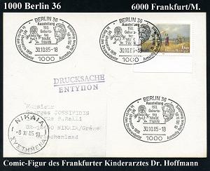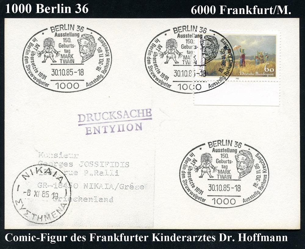 91 | 15 € | 6 Frankfurt/Main Sonder- und Handwerbestempel : 1000 BERLIN 36/ Ausstellung/ 150.Geburts-/ tag/ MARK TWAIN/ ..übersetzt../ den Struwwelpeter.. 1985 (30.10.) SSt = Kopfbild Mark Twain + Struwwelpeter vom frankfurter Art Dr. Hoffmannn , klar gest. Ausl.-Karte | ![]() | |