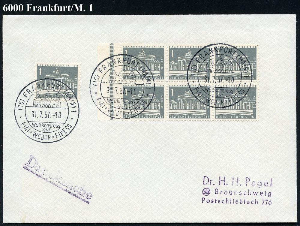 157 | 16 € | 6 Frankfurt/Main Sonder- und Handwerbestempel : (16) FRANKFURT (MAIN) 1/ Weltkongress/ FIAI-WCOPT-FIPESCO 1957 (31.7.) SSt = Römer 3x auf Inl.-Bf. (Bo.243) | ![]() | |