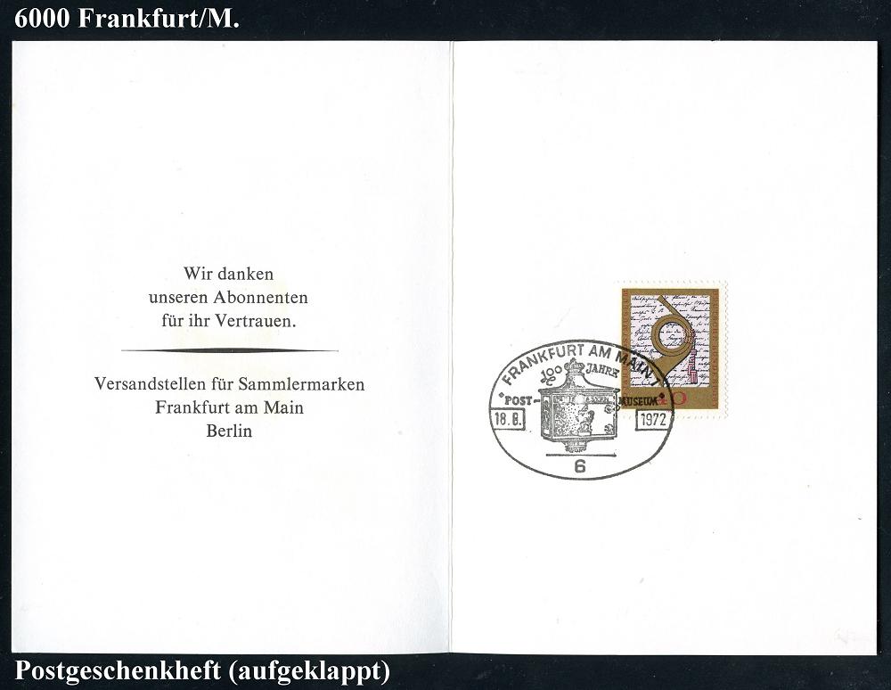 180 | 10 € | 6 Frankfurt/Main Sonder- und Handwerbestempel : 6 FRANKFURT AM MAIN/ 100 JAHRE/ POST-MUSEUM 1972 (18.8.) SSt = histor. Briefkasten auf 10 Pf. Posthorn in motivgleichem Post-Geschenkheft (Format C6) (Bo.612) | ![]() ![]() | |