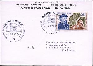 177 | 16 € | 6 Frankfurt/Main Sonder- und Handwerbestempel : 6 FRANKFURT AM MAIN 1/ HISTOR.AUSSTELLUNG/ 1871-FRAGEN AN DIE DEUTSCHE GESCHICHTE 1971 (4.6.) SSt = Paulskirche (Ort der Nat.-Vers. 1848) auf EF 045 F. "Belagerung von Belfort 1870-71" (Mi.1731) zulässige Ausl.-Antwort-Kt. n. Frankreich!, Unikat! (Bo.564) | ![]() | |