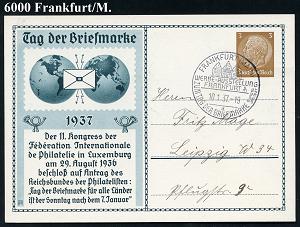 112 | 18 € | 6 Frankfurt/Main Sonder- und Handwerbestempel : FRANKFURT (MAIN)/ WERBE-AUSSTELLUNG/ a/ ZUM TAG DER BRIEFMARKE 1937 (10.1.) SSt auf PP 3 Pf. Hindenbg., braun: Tag der Briefmarke/ 11. FIP-Kongress (Mi. PP 122/C 30-02) klar gest. Inl.-Kt. (Bo.71 a) | ![]() | |