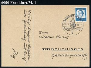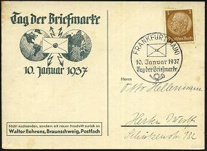 113 | 15 € | 6 Frankfurt/Main Sonder- und Handwerbestempel : FRANKFURT (MAIN)/ Tag der Briefmarke 1937 (10.1.) SSt auf Reklame-Sonder-Kt. "Tag der Briefmarke" (halbe Reklame-Kt. Fa. Behrens) Fern-Kt. (Bo.72) | ![]() | |