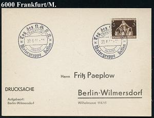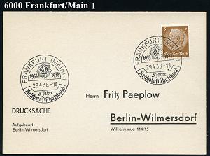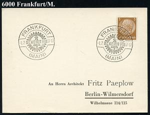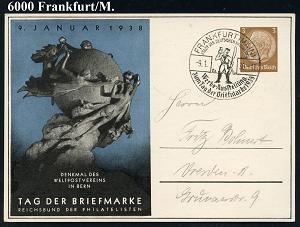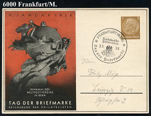 117 | 20 € | 6 Frankfurt/Main Sonder- und Handwerbestempel : FRANKFURT (MAIN)/ ..R.d.Ph./ Tag d.Briefmarke 1938 (9.1.) SSt auf PP 3 Pf. Hindenbg., braun: TAG DER BRIEFMARKE.. = UPU-Denkmal r o t (Mi. PP 122/C 70-02) klar gest. Inl.-Kt (Bo. 82) | ![]() | |