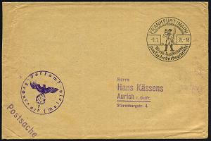 115 | 18 € | 6 Frankfurt/Main Sonder- und Handwerbestempel : FRANKFURT (MAIN)/ SDDH/ Werbe-Ausstellung/ zum Tag der Briefmarke 1938 (9.1.) SSt = Postillon + viol. HdN: Postamt/ Frankfurt (Main) 9, klar gest. Postdienst-Bf., seltene Verwendung! (Bo. 81) | ![]() | |