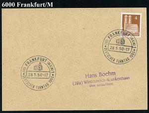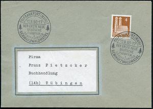 142 | 14 € | 6 Frankfurt/Main Sonder- und Handwerbestempel : (16) FRANKFURT (MAIN) 1/ DEUTSCHER TURNTAG 1950 (28.5.) SSt = Paulskirche , klar gest. Inl.-Drs.-Kt. (Bo.135) | ![]() | |