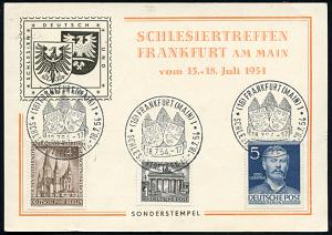 152 | 20 € | 6 Frankfurt/Main Sonder- und Handwerbestempel : (16) FRANKFURT (MAIN) 1/ SCHLESIERTREFFEN 1954 (18.7.) SSt (Schles. u. Oberschles. Wappen) 3x rs. auf motiv-ähnl. Sonder-Kt.: SCHLESIERTREFFEN.. (Michaelis Nr.37 + 20.- DM, 1991) Bedarf ! (Bo.206) | ![]() ![]() | |