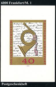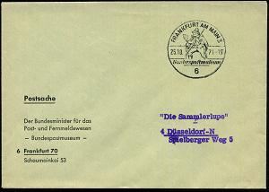 178 | 15 € | 6 Frankfurt/Main Sonder- und Handwerbestempel : 6 FRANKFURT AM MAIN 3/ Bundespostmuseum 1971 (25.18.) HWSt mit Datums-Irrtum = Nürnbg. Bote 16. Jhdt. auf Dienst-Bf.: Der Bundesminister für das Post- u. Fernmeldewesen, Bundespostmuseum.. (Bo.388) | ![]() | |