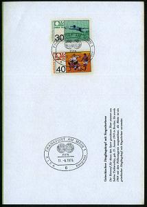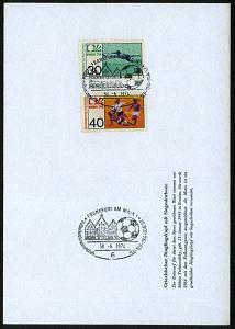 183 | 18 € | 6 Frankfurt/Main Sonder- und Handwerbestempel : 6 FRANKFURT AM MAIN 1/ WM 74/ Presse-/ zentrum/ FIFA-World Cup 1974 (6.6.) SSt auf kompl. Satz Fußball-WM (Mi.811/12) auf amtl. Schmuckblatt-Telegramm "Sport" (Griech. Jünglingskopf m. Siegeslorbeer) ungebr. | ![]() ![]() | |