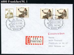 193 | 18 € | 6 Frankfurt/Main Sonder- und Handwerbestempel : 6000 FRANKFURT AM MAIN 1/ 150./ TODESTAG/ J.W.Goethe.. 1982 (22.3.) SSt = Goethe (nach Melchior Kraus) 2x auf motivgl. 3x 60 Pf. Goethe (Mi.3x 1121 u.a.) + RZ: 6 Frankfurt am Main 1/s i, Inl.-R-Bf., schöne Kombination! (Bo.835) | ![]() | |