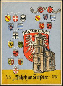 137 | 25 € | 6 Frankfurt/Main Sonder- und Handwerbestempel : (16) FRANKFURT (MAIN)/ JAHRHUNDERTFEIER/ NATIONALVERSAMMLUNG 1948 (18.5.) SSt (Paulskirche) auf seltener Color-Sonderkarte.: Jahrhundertfeier (Michaelis Nr.2, + 50.- DM, 1991) Fernkt., (Bo.116) | ![]() ![]() | |