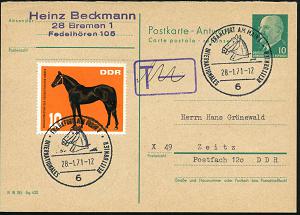 174 | 16 € | 6 Frankfurt/Main Sonder- und Handwerbestempel : 6 FRANKFURT AM MAIN 1/ INT.REITTURNIER 1971 (28.1.) SSt (Pferdekopf) auf DDR-Antwort-P. 10 Pf. + 10 Pf. Zuchthengst (Mi.P 77 A, Mi.1303) + irrtüml. Nachporto-Ra. (gestrichen) zulässige DDR-Antwortkt. nach Zeitz!, Unikat! (Bo.462 , III. Verwendung.) | ![]() | |