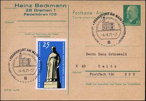 176 | 16 € | 6 Frankfurt/Main Sonder- und Handwerbestempel : 6 FRANKFURT AM MAIN 1/ HISTOR.AUSSTELLUNG/ "1871-FRAGEN AN DIE DEUTSCHE GESCHICHTE" 1971 (4.6.) SSt = Paulskirche auf Antwort-P 10 Pf. Ulbricht (kl. Rißchen) + DDR 25 Pf. Putten-Mahnmal (Mi.1141) zulässige Antwort-Kt. n. Zeitz, seltene Kombination! (Bo.564) | ![]() | |