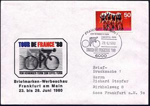 192 | 10 € | 6 Frankfurt/Main Sonder- und Handwerbestempel : 6000 FRANKFURT AM MAIN 1/ VOM HENNIGER-TUM/ ZUM EIFFEL-TURM/ TOUR DE FRANCE 1980 (28.6.) SSt = Piktorgramm Radsport klar auf passender EF 50 Pf.+ 25 Pf. Bahn-Vierer (Mi.Berlin 567, EF + 11.- EUR) auf SU: TOUR DE FRANCE ´80 | ![]() | |