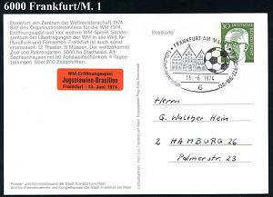187 | 12 € | 6 Frankfurt/Main Sonder- und Handwerbestempel : 6 FRANKFURT AM MAIN 1/ Fußballweltmeisterschaft.. 1974 (13.6.) SSt = Fußball u. "Römer" auf passender PP 30 Pf. Heinemann, grün: Fußball.WM 1974 (5 Ansichten, dabei Stadion, Göethhaus, Römer etc.) + Label: WM-Eröffnungsspiel Jugoslawien - Brasilien.. (Mi.PP 46/18) | ![]() ![]() | |
