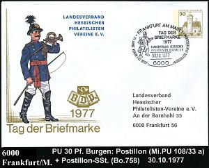190 | 10 € | 6 Frankfurt/Main Sonder- und Handwerbestempel : 6000 FRANKFURT AM MAIN 1/ TAG DER/ BRIEFMARKE.. 1977 (30.10.) SSt = Postlllon auf PU 30 Pf. Burgen, braun: Tag der Briefmarke.. (Postillon) Inl.-Bf. (Mi.PU 108/330) | ![]() | |