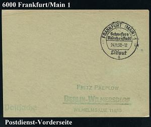 127 | 18 € | 6 Frankfurt/Main Sonder- und Handwerbestempel : FRANKFURT (MAIN) 1/ Schaefers/ Märchenstadt/ Liliput/ a 1938 (24.11.) seltener SSt klar auf Postdienst-Vorderseite (Bo.92) | ![]() | |