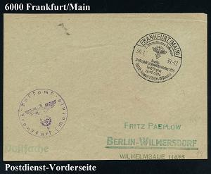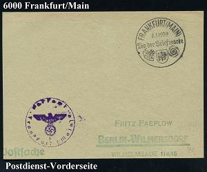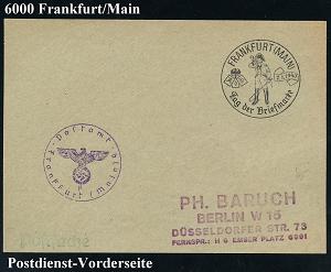 133 | 10 € | 6 Frankfurt/Main Sonder- und Handwerbestempel : FRANKFURT (MAIN)/ RdPh/ Tag der Briefmarke 1940 (7.1.) SSt = Postillon + viol. 1K-HdN: Postamt/l2/Frankfurt (Main) 9 , klar gest. Postdienst-Vorderseite (Bo.99) | ![]() | |