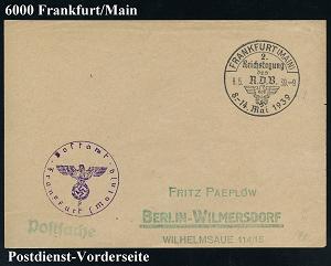 130 | 12 € | 6 Frankfurt/Main Sonder- und Handwerbestempel : FRANKFURT (MAIN)/ 2.Reichstagung/ des/ R.D.B./ 8.-14.Mai 1939 (8.5.) SSt = RDB-Logo mit Hakenkreuz + viol. 1K-HdN: Postamt/l2/Frankfurt (Main) 9 klar auf Postdienst-Vorderseite (Bo.95) | ![]() | |